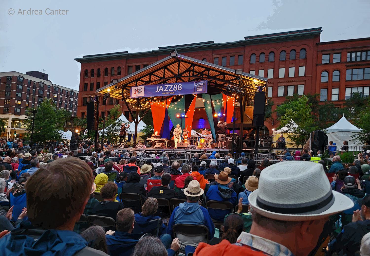 Twin Cities Jazz Festival at Mears Park and Beyond. Up front, I only was able to cover music at Mears Park, but this festival spread out not only in Lowertown St Paul but across the metro, into downtown St Paul and Minneapolis, over to Fridley, and the West Bank. (As new Executive Director Dayna Martinez, said “It is the Twin Cities Jazz festival!”) Fortunately there were many indoor, weather-friendly venues for performances and master classes. Although the forecast throughout the weekend was stormy, rain never washed out a main stage performance; there were some periods of raised umbrellas and a downpour between sets that required quick mopping to keep the schedule on track.